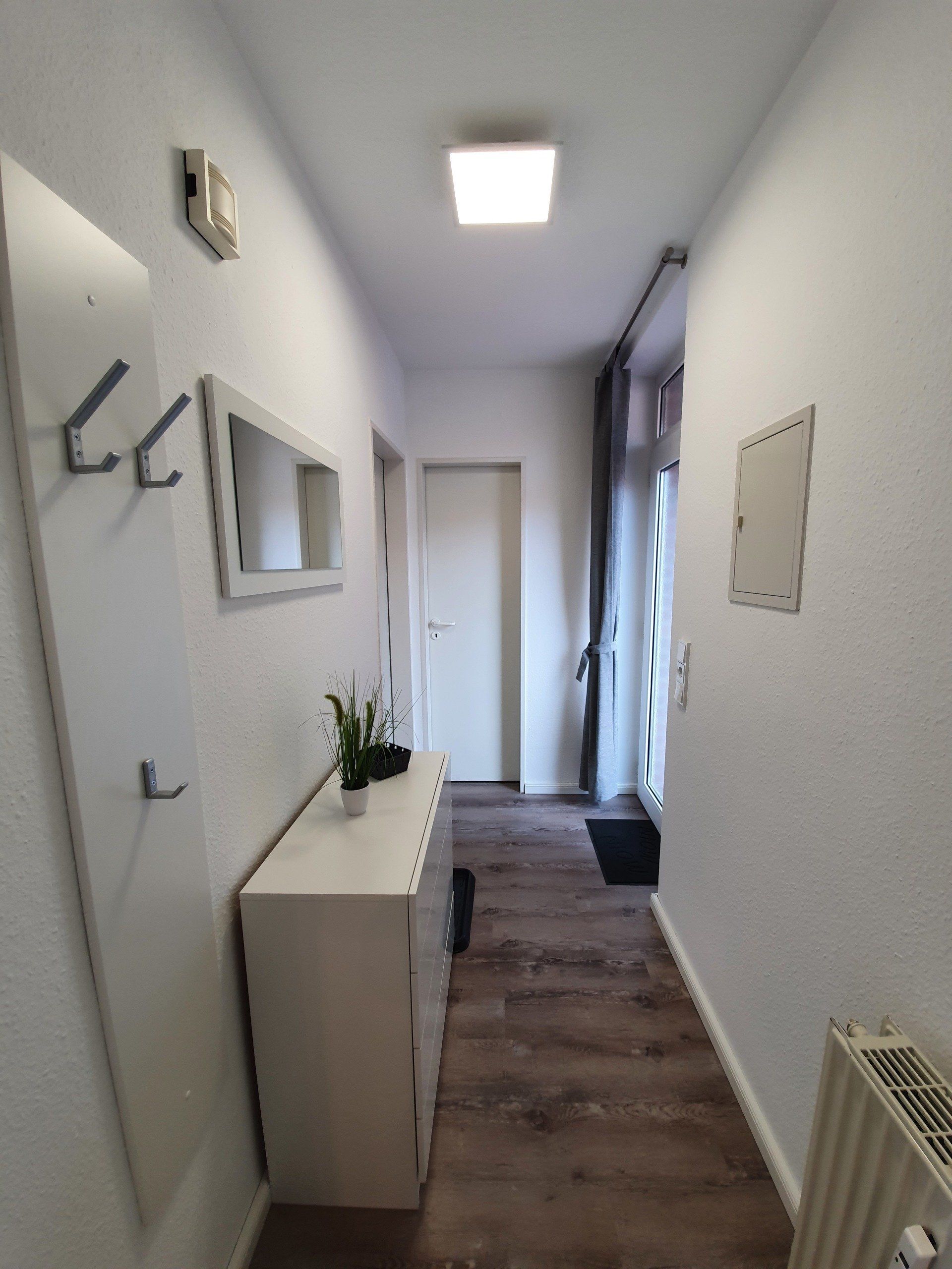 Das in 2022 kernsanierte Badezimmer ist neben einem spülrandlosem WC, mit einem Waschtisch und Waschtischunterschrank, mit einem LED Spiegel, einem Fön, einer Dusche mit bodennahem Einstieg, einer Regen- und Handbrause und einem großen Handtuchheizkörper ausgestattet.
